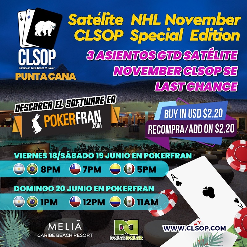 Premio: paquete garantizado de us1.400 (buy in del CLSOP en vivo y estadía por 5 días).