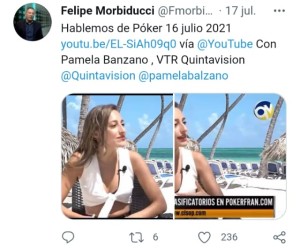 El programa estuvo conducido por el jugador de Poker y dirigente deportivo, Felipe Morbiducci. La invitada fue Pamela Balzano, fotógrafa y youtuber de Poker, en un programa que ha sido bien evaluado en las redes sociales, como podemos ver en el Twitter de Morbiducci, alcanzando más de 200 likes a dos días de su emisión.
