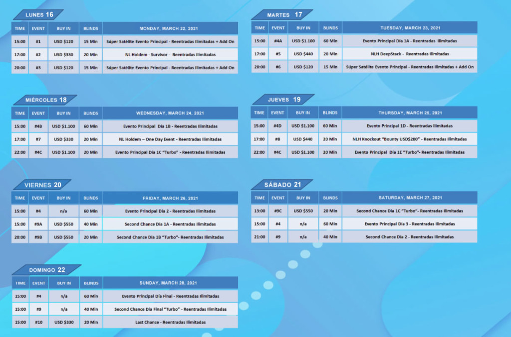 Será una semana completa de póker con una mesa televisada en un novedoso formato a cargo de Marco Sarabia, quien estará acompañado de grandes invitados, además de los Directores de torneo estrella a nivel Latino, Fernando Obando y Rodrigo Aros, quienes estarán al tanto de toda la acción en Noviembre.